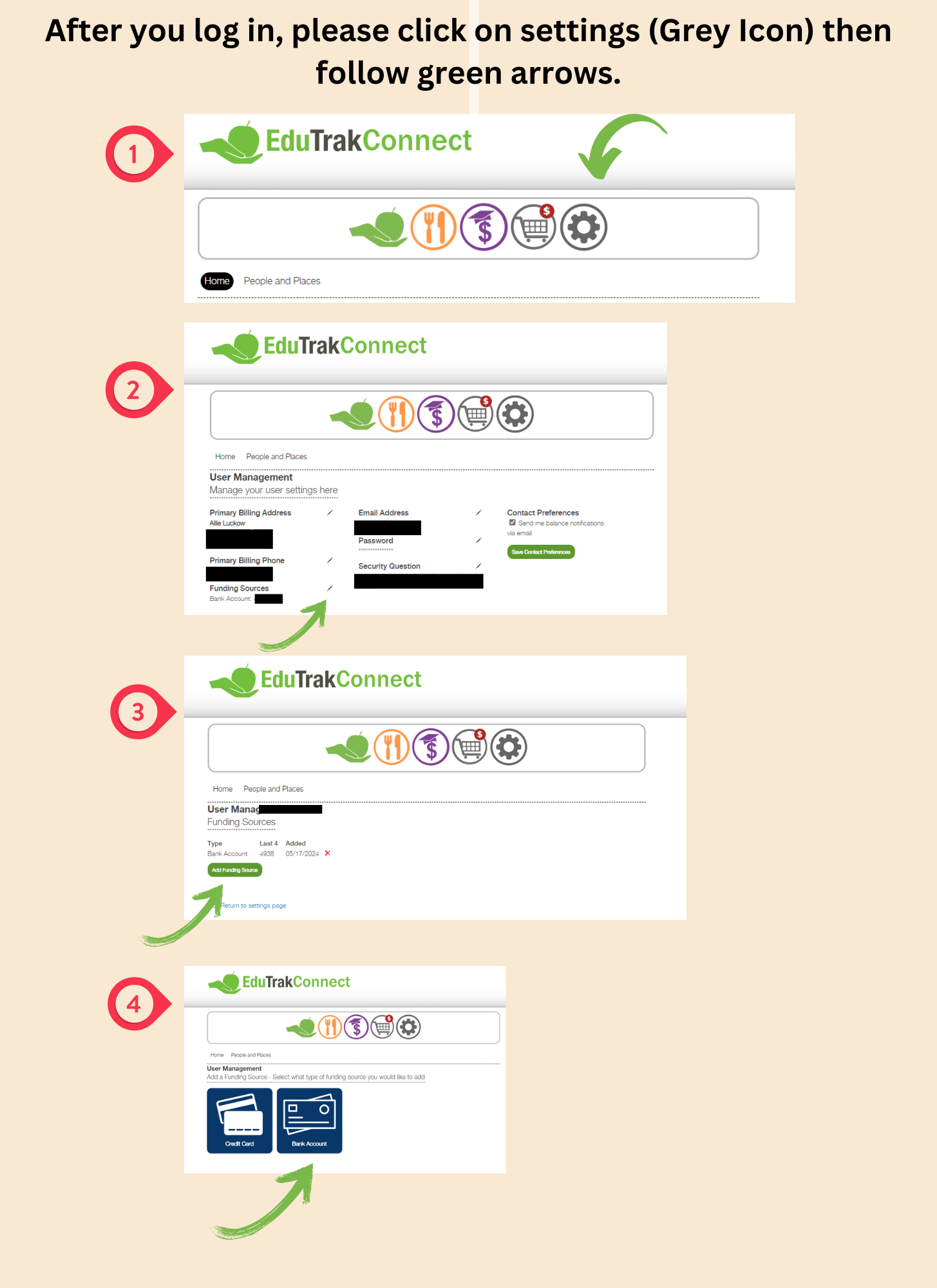 (https://lobby.edutrak.com/) and make sure you clicked on "Enable Auto Payments" Please see the example below. If you have missed payments because of this, you need to manually add them to your cart and pay, then the following month they will be on autopay. If you need to change your banking information, also please see below.